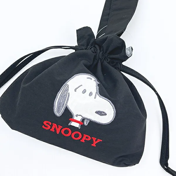 スヌーピーのアップリケ刺繍巾着バッグ、キュッと絞った丸いフォルムにときめきがとまらない。