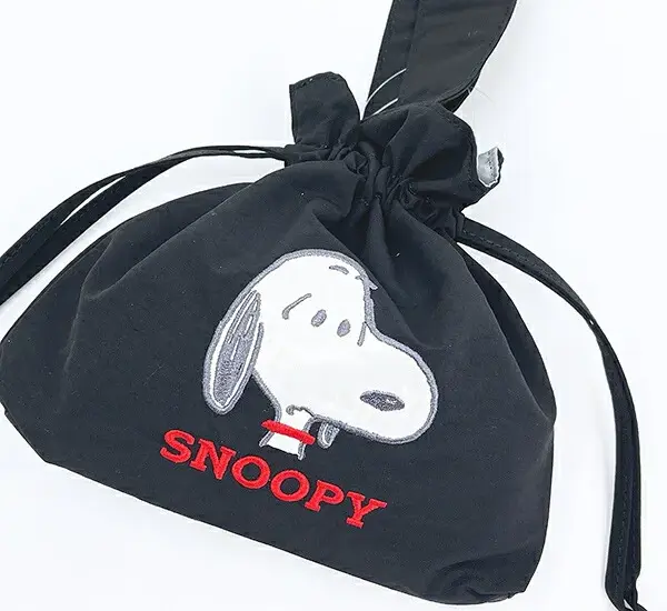 スヌーピーのアップリケ刺繍巾着バッグ、キュッと絞った丸いフォルムにときめきがとまらない。