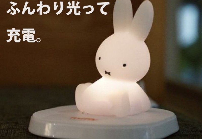 テーブルで優しくひかっているワイヤレス充電器。ミッフィアイテ...