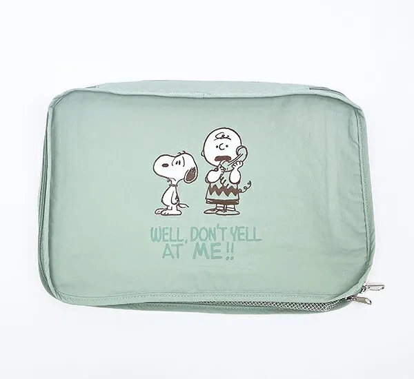 目を惹くグリーンカラー。「スヌーピー」の収納ポーチで、旅行も楽々。使い勝手の良いバッグや...