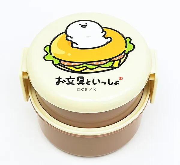 お文具といっしょの丸形ランチボックス&音の鳴らないコンビセットが登場しました。ハンバーガーの上でのんびりくつろぐお文具さんの姿と、クリーム色&茶色の優...