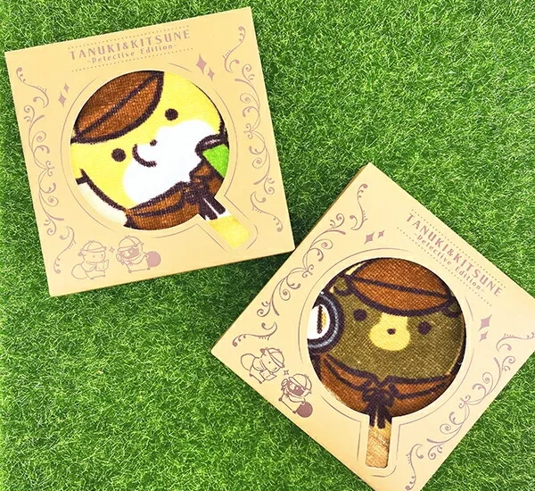 タヌキとキツネの吸収性に優れたタオルハンカチ2種。たんていさん姿が可愛らしくプレゼントにも...