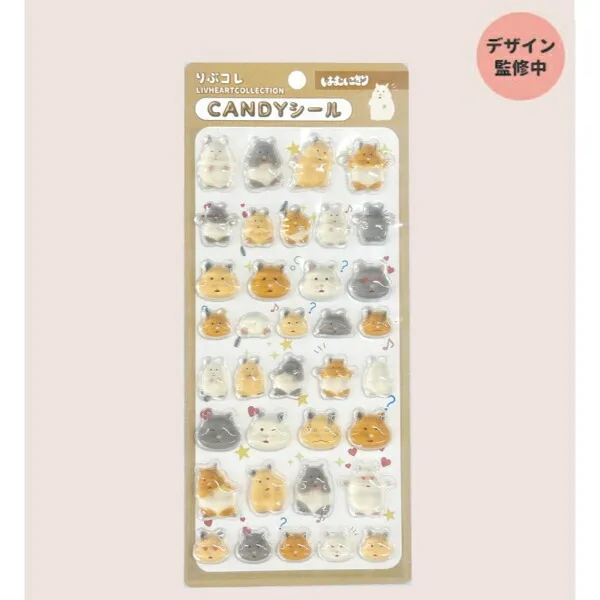まずご紹介するアイテムは、「りぶはあと」のりぶコレ(LIVHEART COLLECTION)シールです。こちらは大人気のはむにぎり。4種類のハムスターたちのきょとんとした表情やポーズが愛らしい。