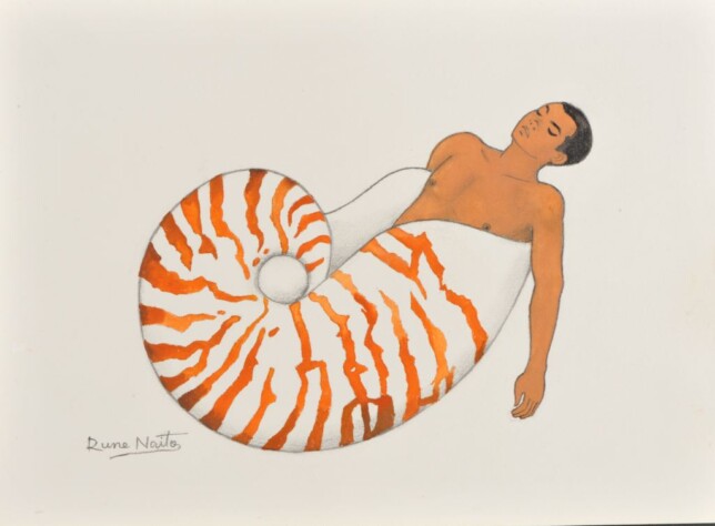 こちらの男性画も2007年に描かれたもの。ゲイ雑誌『薔薇族』で掲載された作品を新たに描き下ろしてています。オウム貝の作品は他にもいくつか存在していますが、いずれも目を閉じていて、深海で息を潜めて眠っているような印象です。自身がゲイであるからこそ描ける作品なのかもしれません。本当に奥が深いんですよ。