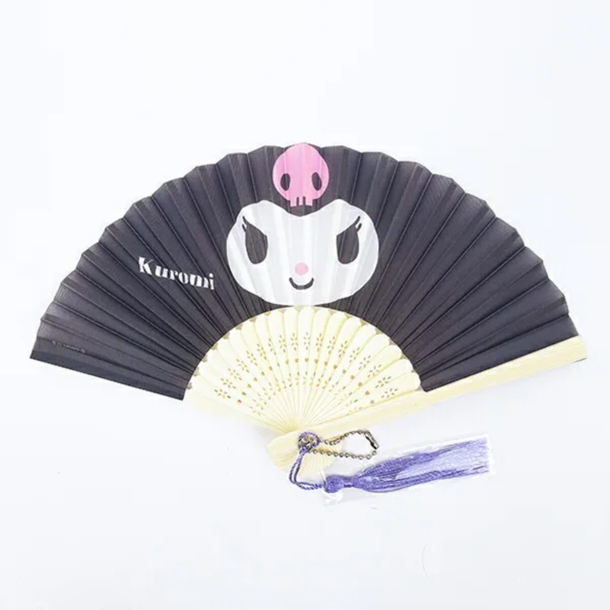 こちらはクロミです。クロミはイメージカラーのブラックがちょっとクールかわいい印象です。扇子はかばんにいれるとちょっとかさばる印象があるのですが、こちらならミニサイズかつ、カバンに取り付けることができるので、そんなお悩みも解消してくれそうです。また、お子様にも持ちやすいサイズなのでお出かけにもぴったりですよ。