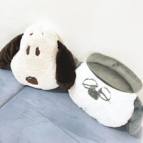 ふわふわの毛並みで最高の触り心地。クッションの横からは、ごろ〜んとしたスヌーピータグが。
