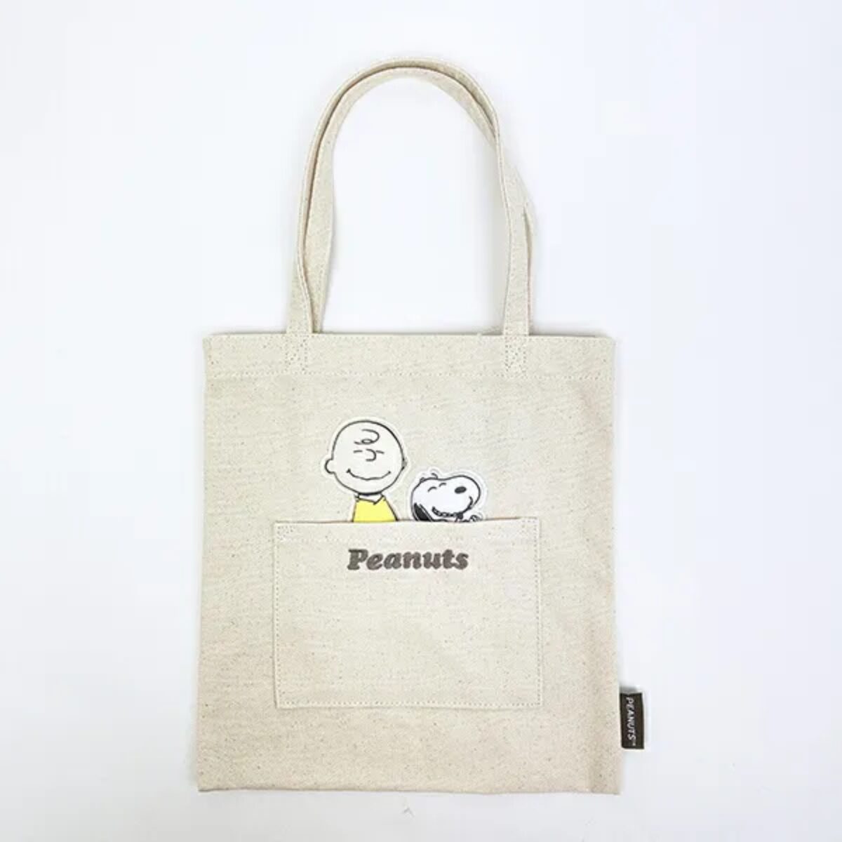 今回ご紹介するのは、シンプルなかわいさが万人受け最強のキャラクター「スヌーピー」をモチーフにした生活アイテムをご紹介させていただきます。今回はポケットからひょっこり顔を出すキャラクターがポイントのシンプルトートバッグです。