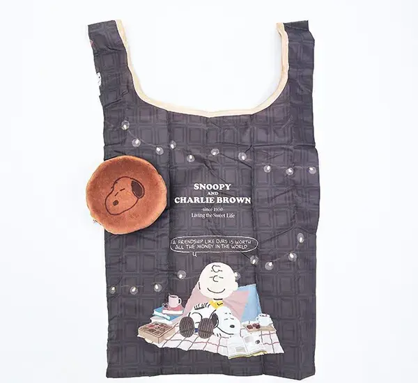美味しそうなポーチが付いた、スヌーピーの折りたたみエコバッグ。バッグチャームにして、一緒に連れてお出かけしたくなります!