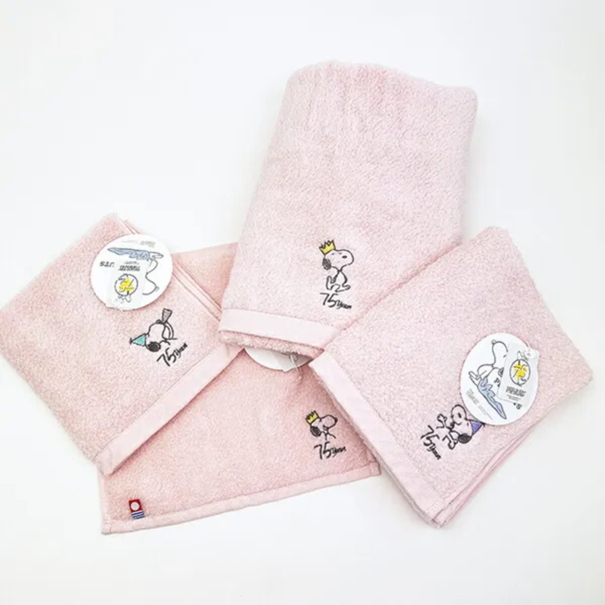 スヌーピー75周年記念アイテム。さりげないかわいさに肌触り抜群な高品質なタオルです。